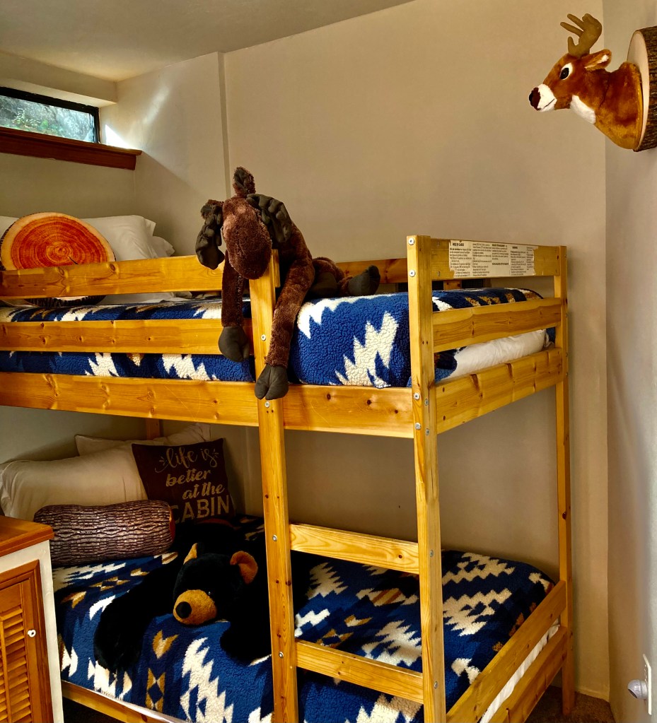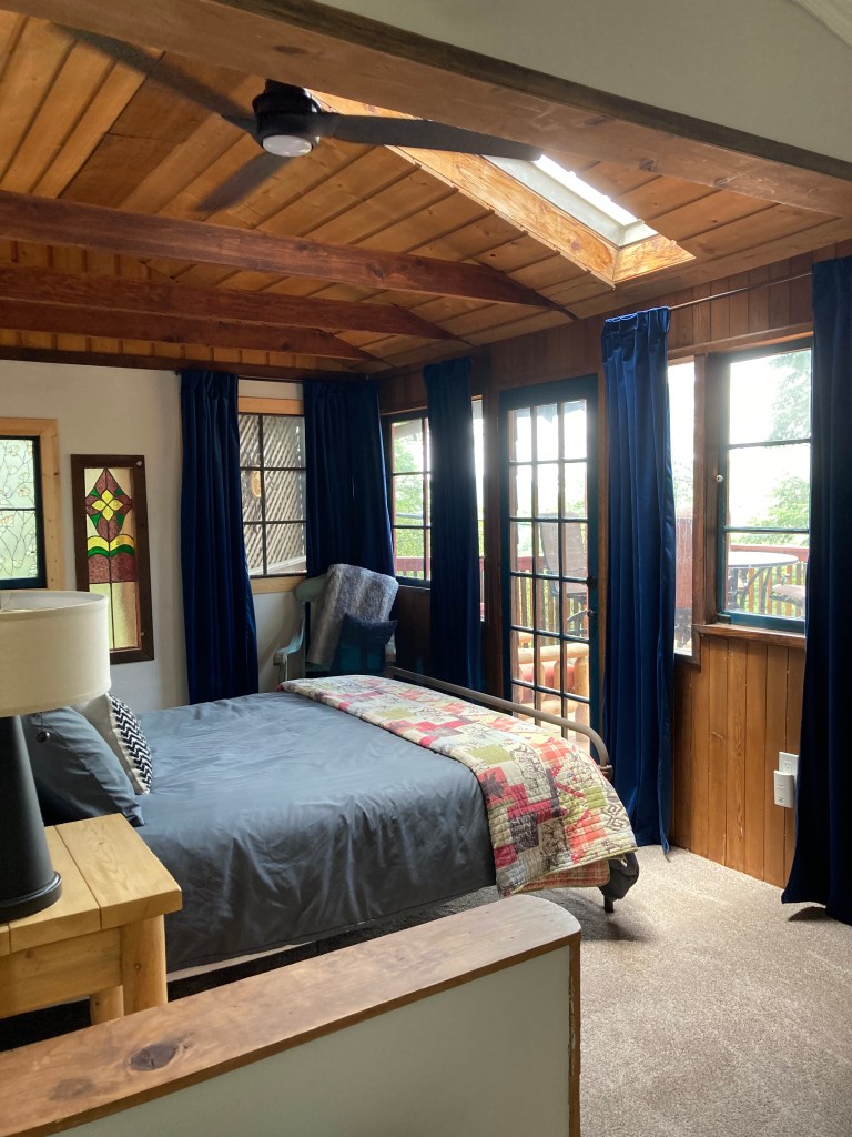 Across the hall from the kids bunk bed room is the Queen bedroom. This room has a private sitting area with oversized leather chair and ottoman great for catching up with work or relaxing with a book. There is a propane wall heater for those chilly nights. From the bed, you have a view of the deck and tall trees.