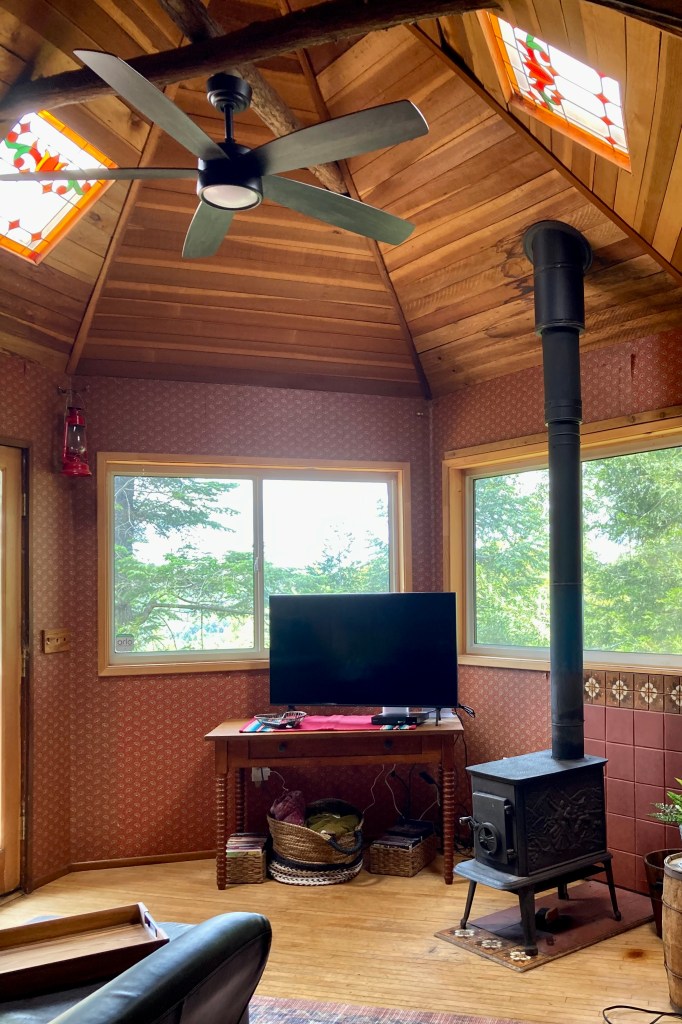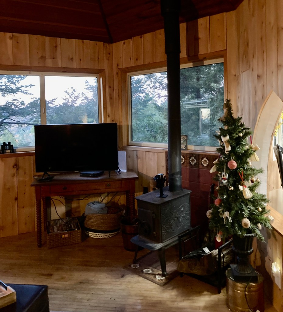 -The Dome room includes daybed, DVD player, Wi-Fi and satellite TV keep you in touch with the outside world while you enjoy the warmth of the wood stove or relax with a good movie. Nestle up on the day bed or leather couch to enjoy a book or take in the view of the 80 ft. cedar trees.
