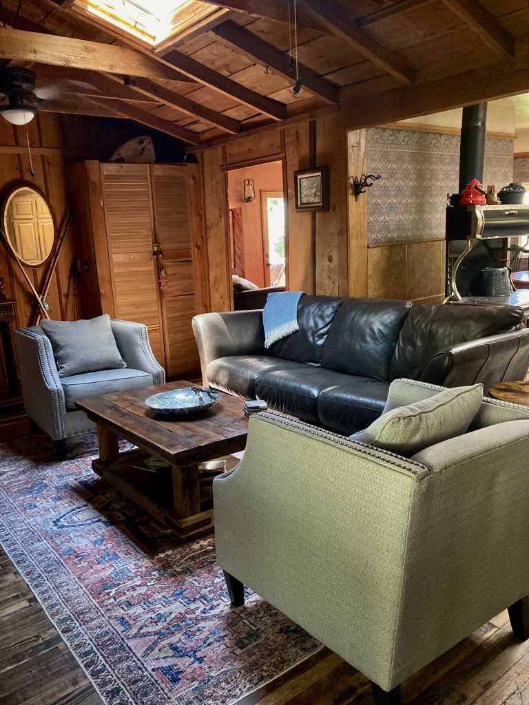 The Living room has a leather couch and upholstered chairs to relax in front of the original fireplace built in 1923. The mantle and fireplace is built with local lumber and stone.