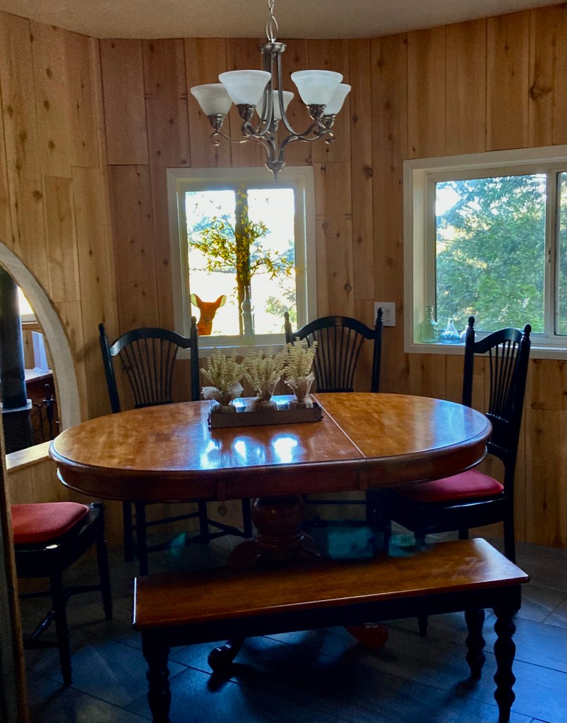 Up the spiral stairs to the Master King bedroom, the views don’t disappoint. Stay warm and cozy with the wood stove during winter months. The eagles nest alcove offers 180 degree view of the surrounding area and is equipped with a telescope for star gazing. Relax with your morning coffee or evening glass of wine in the rockers.
